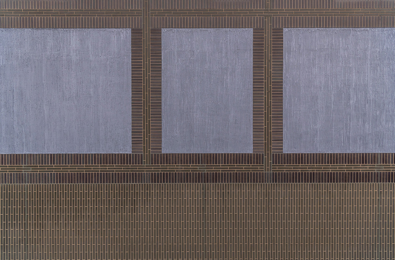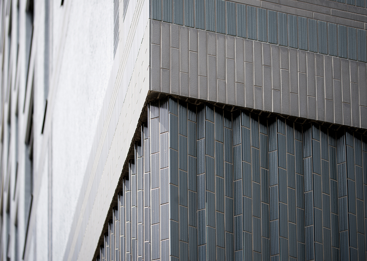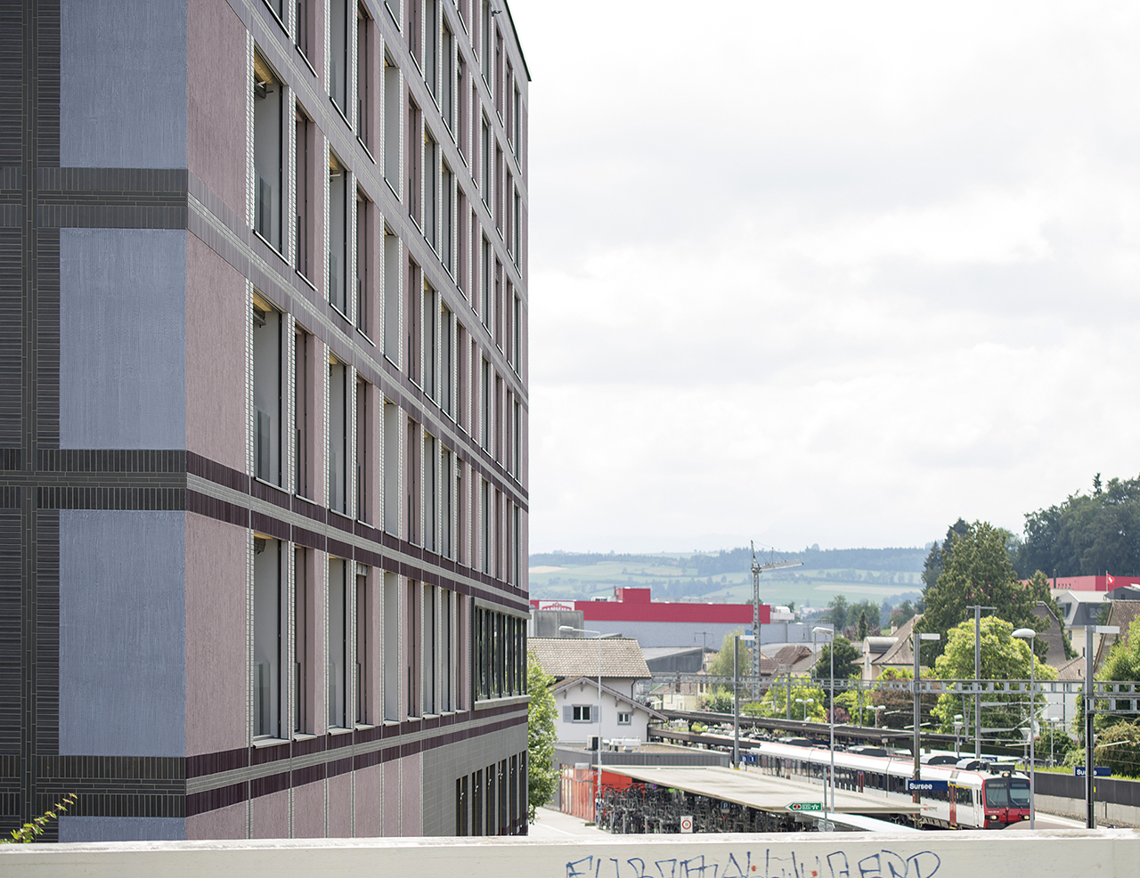Ein vertikales und horizontales Gliederungssystem prägt die Aussenfassaden. Als Konstante zeigt sich ein dunkles, unbuntes, mattes, unstrukturiertes Keramik. Es definiert sich als gemeinsamer Nenner der Fassaden mit der Absicht, den Baukörper optisch zusammenzuhalten, ihn zu binden und zu schnüren. Das zweite prägende Element der Fassaden ist ein glänzendes, gerilltes Keramik, welches pro Fassadenseite eine andere Farbigkeit aufweist. Situativ wird das Sonnenlicht an der glänzenden Rillenstruktur des Keramiks gebrochen. Eine Reflexion entsteht. Die Putzfelder der Fassaden sind ebenfalls mit einer Rillenstruktur ausgebildet und mit einer an das Keramik angepassten, tuchmatten Farbigkeit angelegt. Je nach Betrachtungsperspektive des Volumens und mit den sich stetig ändernden Lichtverhältnissen generiert die Fassade laufend neue Bilder.