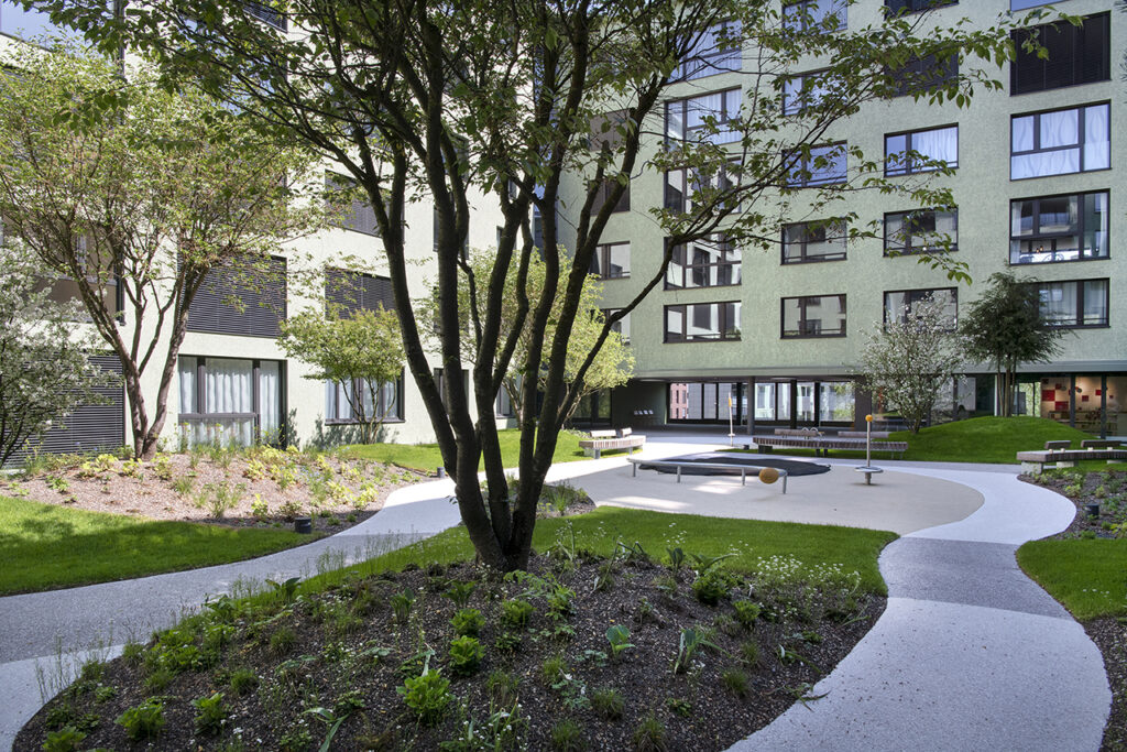 Der Innenhof soll eine entspannende Atmosphäre schaffen. Ein Kontrapunkt zur urbanen Aussenwelt. Als prägendes Element steht die Natur im Fokus. Die Fassadenflächen nehmen in ihrer Gestalt Bezug zur natürlichen Begrünung. Mehrere Grüntöne überlagern die Putzstruktur und beziehen sich in abstrakter Form und Widerhall auf die flatternden Blätter und Nadeln der Bäume. Zusammen mit der Putzstruktur ergeben sie einen changierenden Effekt mit einer Tiefenwirkung. Ein abstraktes Ornament mit einer visuellen Innenhoferweiterung entsteht. Die Fassadenfläche wird optisch in impressionistischer Art aufgelöst.